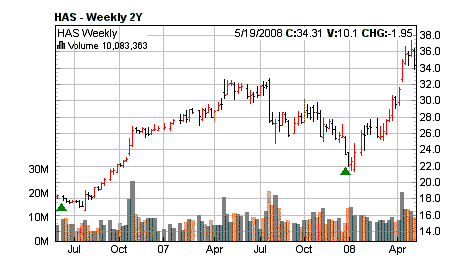 The next downtrend exhaustion alert for HAS was issued on January 11, 2008 at 22.34. The downtrend made major low on January 22 at 21.57. By May 14 HAS gained almost 68%, trading at 37.35.