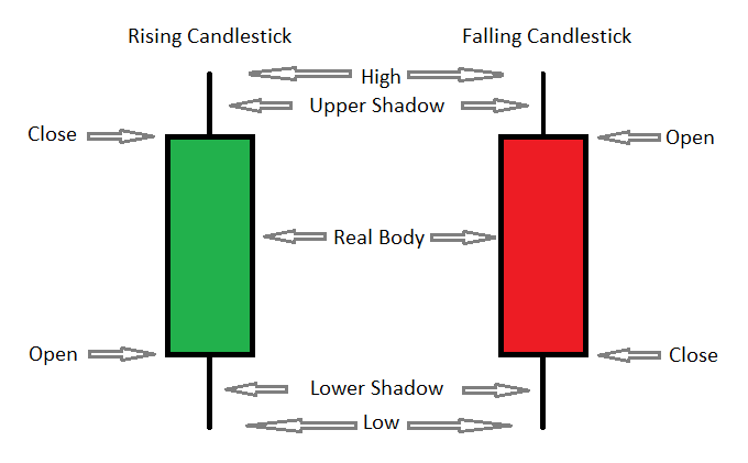 The Candlestick Real Body is a thicker section of the candlestick between the open and close prices. If the close price is higher than the open price, the bottom of the body represents the open price and the top of the body represents the close price. In this case, the candlestick body is usually filled with green, blue, or white. If the close price is lower than the open price, the bottom of the body represents the close price and the top of the body represents the open price. In this case, the candlestick body is usually filled with red or black. The thin line below the candlestick body is called the Lower Shadow. The lowest point of the lower Shadow represents the period low price. The thin line above the candlestick body is called the Upper Shadow. The top point of the Upper Shadow represents the period high price.
